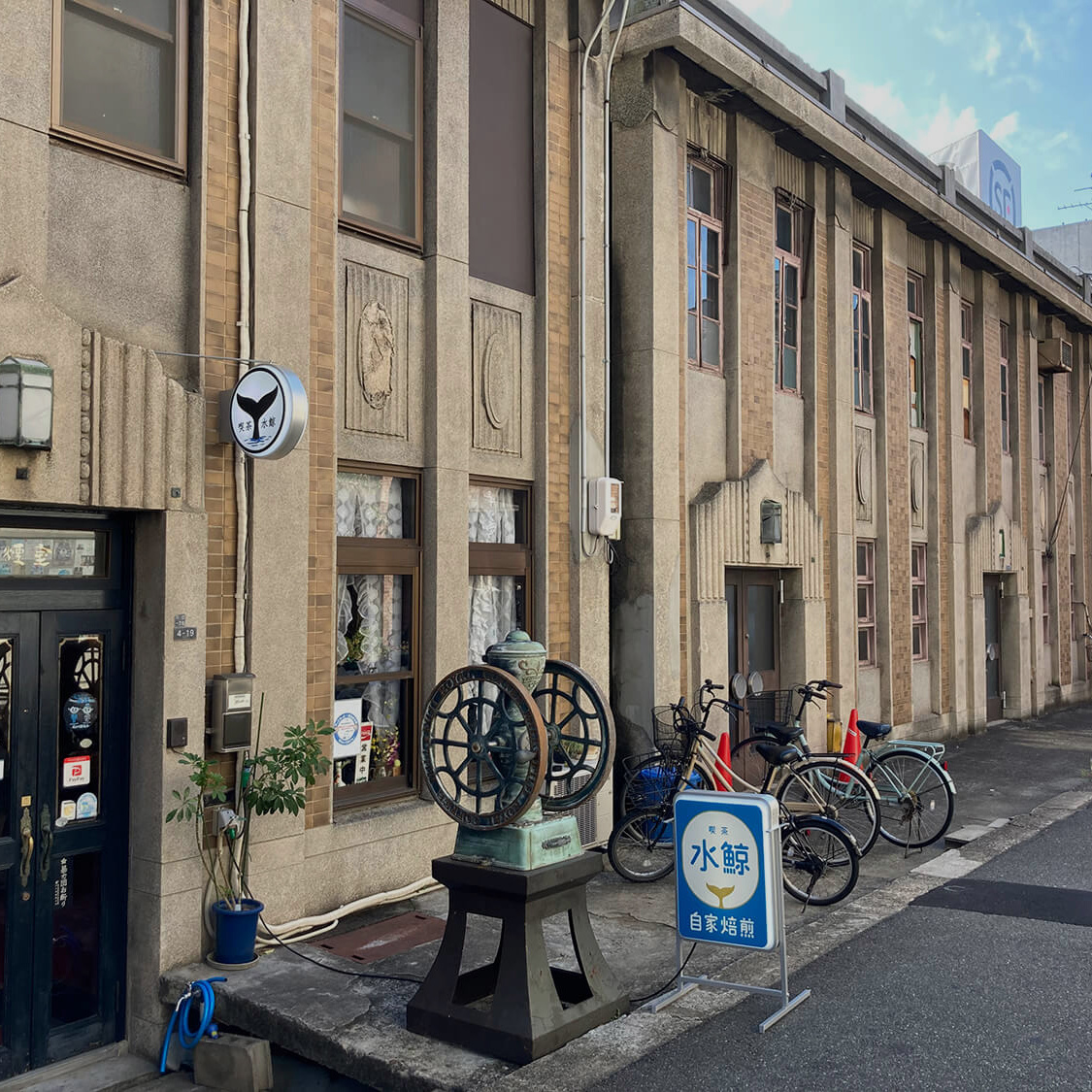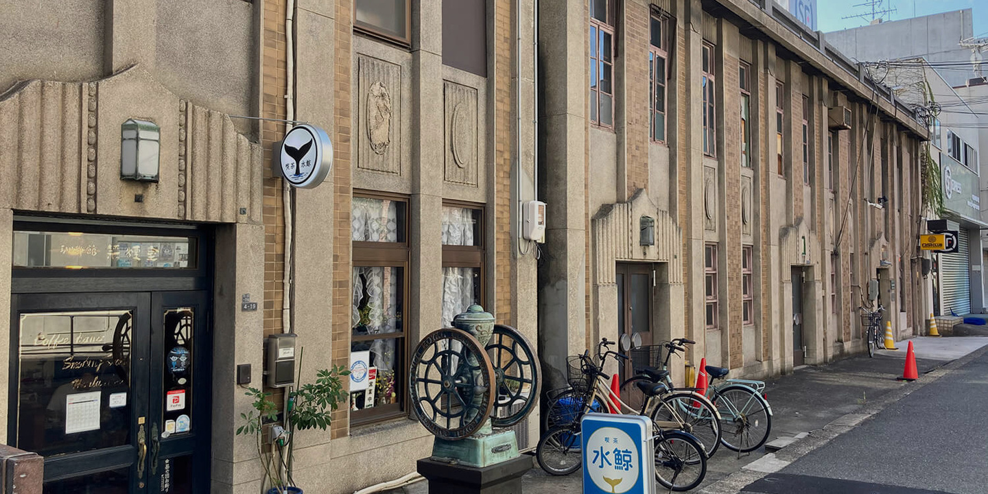 川口教会の向かいには、1928年頃に建てられた通称「川口アパート」と呼ばれる、鉄筋コンクリート造地下1階地上2階の連棟式事務所ビルが、今でも「生きた建築」(注3)として賃貸や売買で取引、使用収益されています。その一角にあるのが、喫茶水鯨です(徒歩7分)。