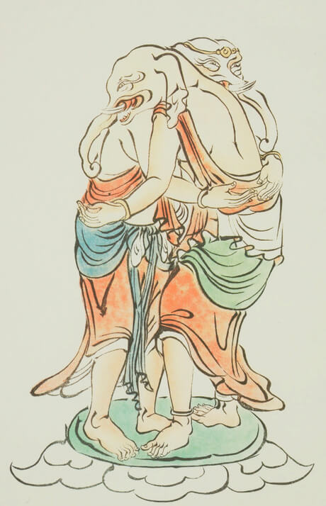 本堂の十一面観世音菩薩が大聖歓喜天(ダイショウカンギテン)を略した「聖天さん」のご本尊ですが、本来の歓喜天は象頭人身の男女二体の立像が向き合って抱擁している秘仏で、男女睦まじく子宝に恵まれ、商売繁盛のご利益が得られるそうです。