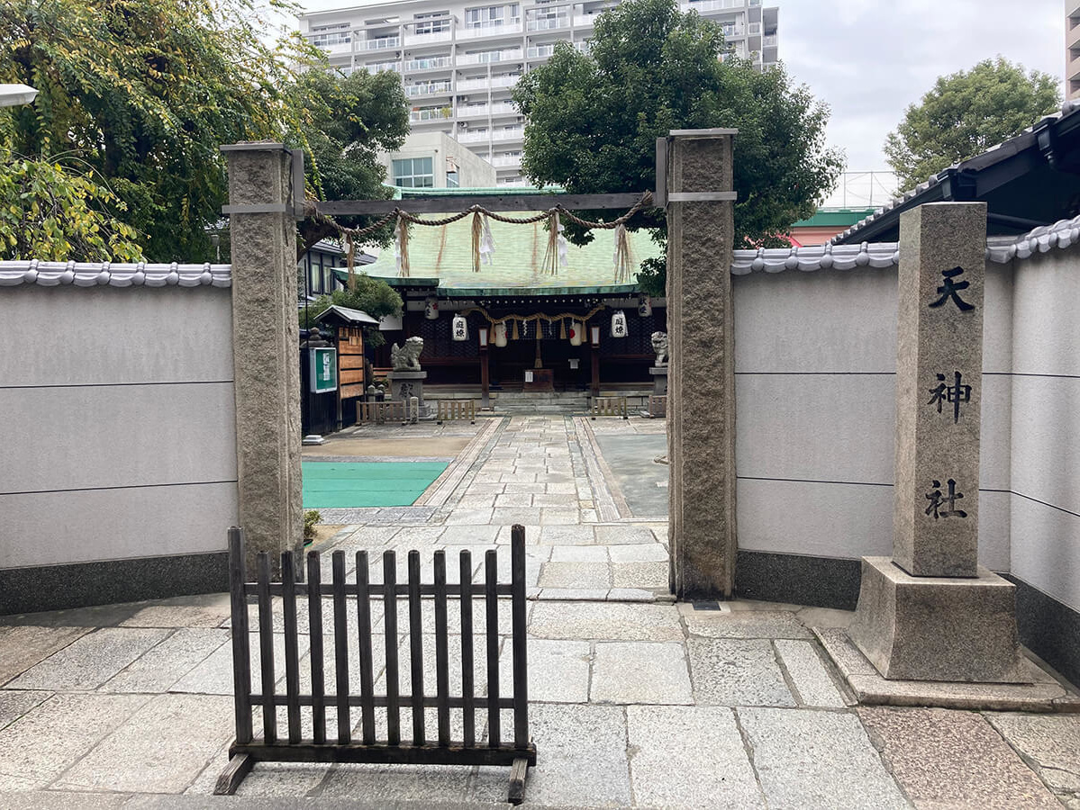 野田恵美寿神社から東に進み、阪神高速神戸線の高架道路の下、新なにわ筋をわたり、下福島中学校の南の路地に沿って中学校の東横が天神社(下の天神)です。