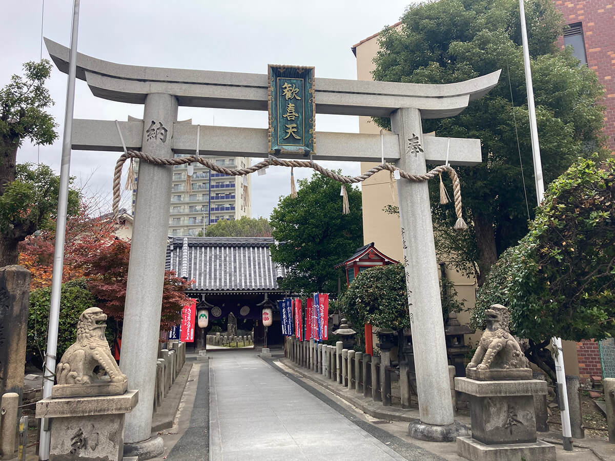 商店街を進み、南北のあみだ池筋を越えた次の道路から、行政区域が福島から鷺洲に変わるのですが、商店街も別の「聖天通商店街」に変わります。この境界となる道は大正時代までは水路で、ここを北側に曲がると、地元で「浦江の聖天さん」と呼ばれて親しまれている福島聖天了徳院があります。